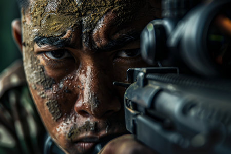 Closeup of a shooter with mud on his face, holding a gun with a focused expression, A close-up of a shooter's concentrated expression