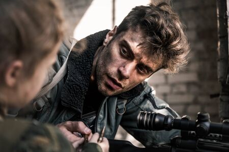 selective focus of handsome man with gun looking at kid with bullet, post apocalyptic concept