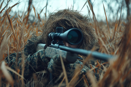 Well-concealed sniper, camouflaged in autumn foliage, demonstrating the skill of blending into the environment. Generative Ai