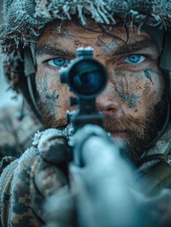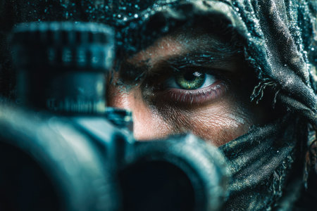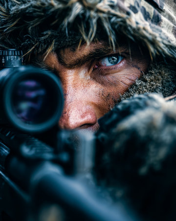 Focused soldier with piercing green eyes peers through a precision scope, masked in detailed camouflage, creating a tense, tactical atmosphere.