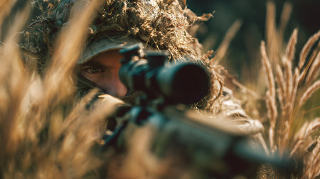 Camouflaged sniper in ghillie suit aiming with assault rifle from concealment in tall grass