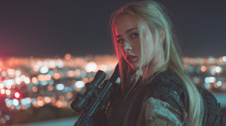 Soldier with assault rifle on the background of the night city.