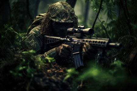 Man in the jungle with machine gun. Dark forest. Selective focus, Ghillie suit sniper camouflage sitting on a jungle , Ai generated