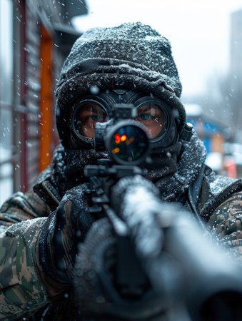 Soldier in tactical gear aims down the sights of his weapon against a snowy backdrop.
