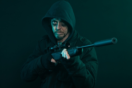 Sniper with beard in black holding gun. Studio shot.