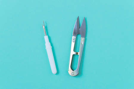 Thread opener and scissors tongs. sewing tool. Turquoise background.