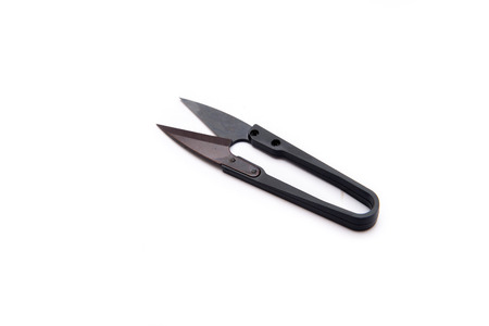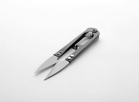 Close-up of mustache scissors with focus on blade tips, white background accentuating shine