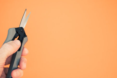 A closeup shot of a hand holding gardening scissors on an orange surface