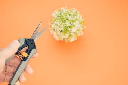 A person holding gardening pruning shears with alyssum flowers on an orange surface - copy space
