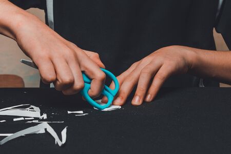 The boy folds and cuts white paper with his hands and scissors. 2020
