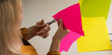 A woman's hand cuts a sheet of white paper with scissors and cuts off the corners. Close-up, DIY concept.