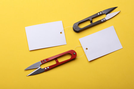 Sewing scissors with tags on yellow background