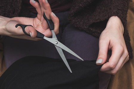 Close-up partial view of female hands citting fabric with scissors fabric