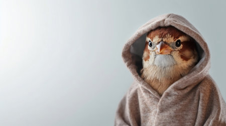 A small sparrow wearing a tiny hoodie, looking intently at the camera with a serious expression, against a plain background.