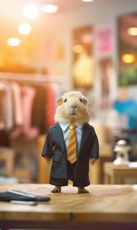 Charming hamster dressed in a business suit and tie, confidently displaying delicate angel wings against a neutral backdrop, providing ample copy space for text or design