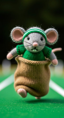 Adorable knitted mouse in a green shirt and hat, standing in a sack on a green surface. Cute St. Patricks Day toy for celebration.