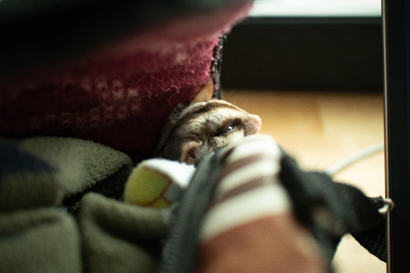 Close up of ittle cute Sugar Glider sneak out of the pet bag.