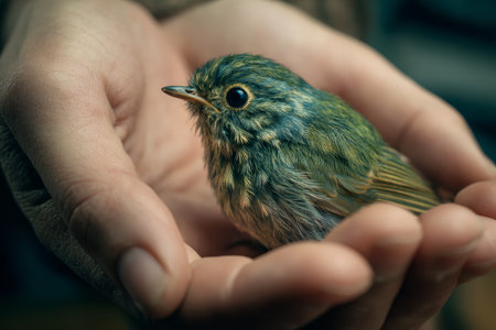 Close up of a human hand cradling a swift bird calmly showing nature care and kindness