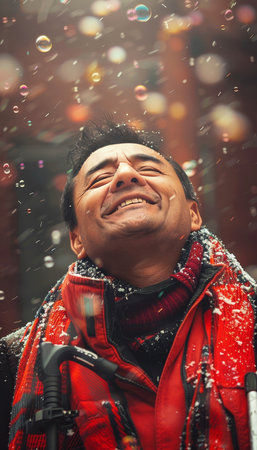 Happy man with crutches plays with bubbles in sunny outdoor setting, exuding joy and positivity