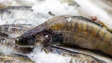 Different types of fresh fish on ice in supermarket, top view. Close up fresh fish on ice bucket or frozen fish in grocery store use for raw food background