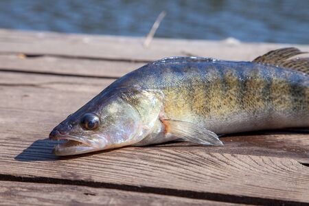 Fishing concept, trophy catch - big freshwater zander fish know as sander lucioperca just taken from the water on vintage wooden background.