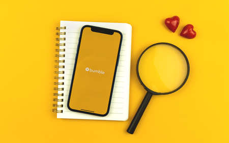 Kharkov, Ukraine - May 28, 2021: Bumble online dating app on the screen of the Apple iPhone, communication application