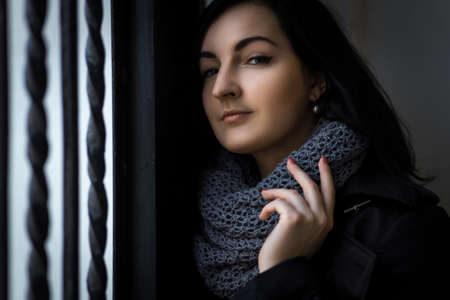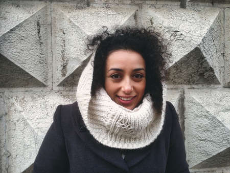 Portrait of a beautiful young woman wearing coat and scarf on the street