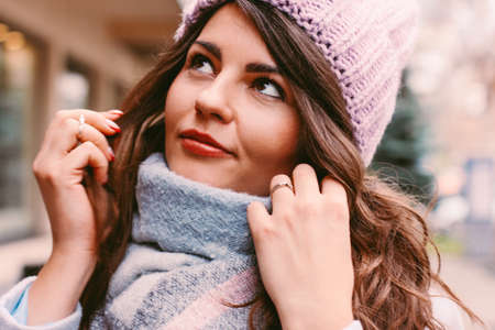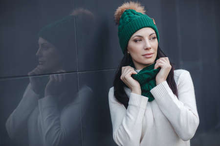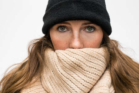 Portrait of woman wrapped in winter had and scarf, winter woolen wearing looking cold