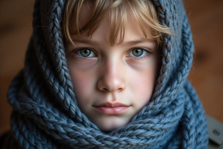 A young child with striking green eyes and blonde hair is wrapped in a cozy gray knit scarf, creating a warm, intimate portrait.