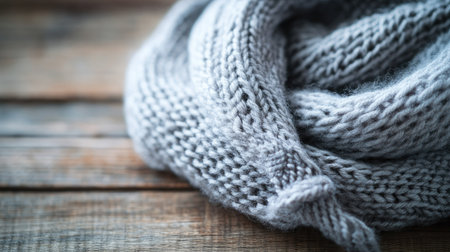 This image features a cozy gray knit scarf elegantly draped over rustic wooden surface, capturing the essence of warmth and style perfect for winter fashion accessories.