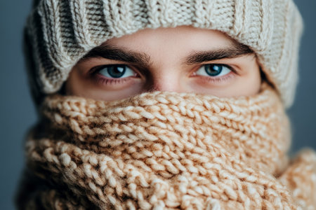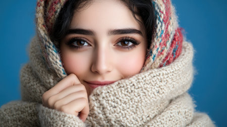 This captivating image features a young woman with beautiful curly hair, warmly wrapped in a soft, chunky knitted scarf. Her serene expression and sparkling green eyes radiate comfort and tranquility, making this a perfect representation of cozy winter vibes.