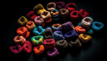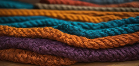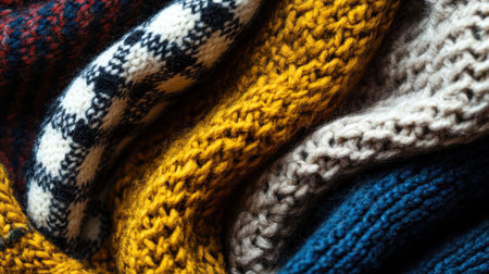 Multi colored woolen garments woven with intricate patterns for winter fashion generated by artificial intelligence
