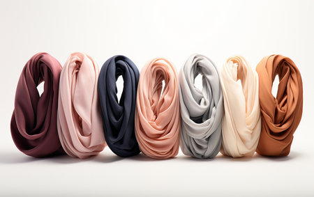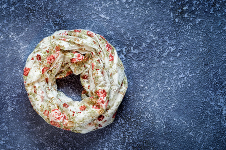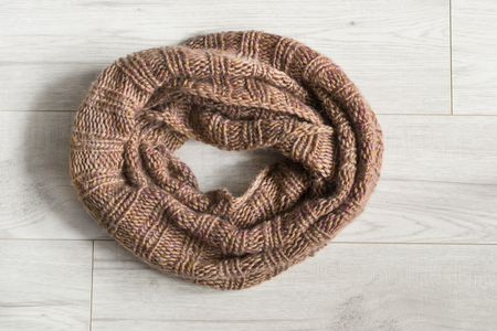Colourful rounded woolen scarf. White wooden desks surface background.