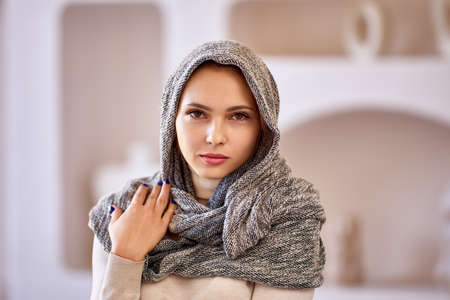 Beautiful girl with clean skin and dark long hair in cozy white sweater and warm scarf on the beige background