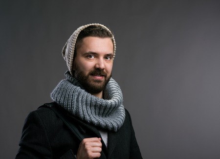 Young hipster man in black winter coat, knitted scarf and beanie. Studio shot on gray background.