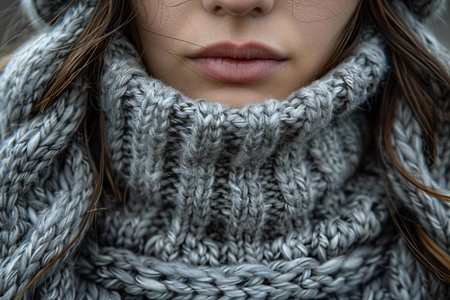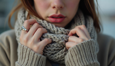 Young caucasian female in cozy knitted scarf with focus on hands and lips.