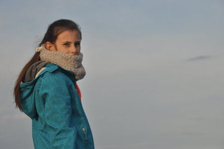 A girl stands by the shoreline, gazing into the distance on a windy day. She wears a blue jacket and a thick scarf, her hair slightly touched by the breeze.