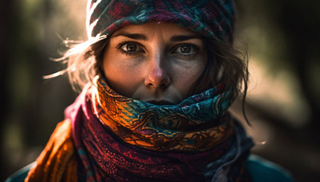 A cheerful young woman with a radiant smile is adorned in a vibrant floral scarf, exuding warmth and positivity. Her bright expression and the colorful scarf create a captivating blend of joy and style, inviting viewers to share in her happiness.