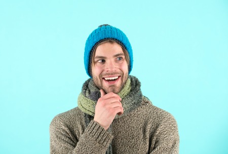 Winter accessories concept. Winter fashion knitted clothes. Knitted accessories as hat and scarf. Man in knitted hat and scarf winter fashion season. Man wear knitted clothes turquoise background.