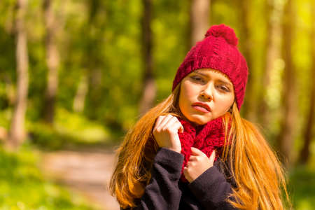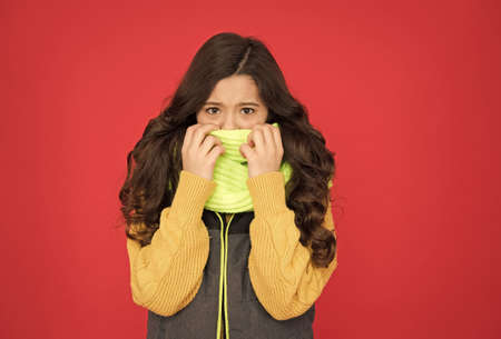 say no to flu. teen girl feel cold in knitted clothes. xmas winter weather. cold season fashion. child with warm clothing. kid ready for holiday. christmas time. new year beauty in style