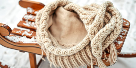 A beautifully crafted beige knitted scarf is elegantly draped over a rustic wooden sled, creating a warm and inviting winter scene.
