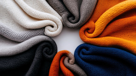 A collection of knitted sweaters in various colors and textures. The colors are arranged in a circle, with the orange and blue sweaters on the outer edge and the white and gray sweaters in the center