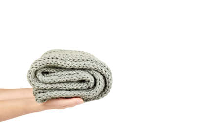 Warm winter clothes in hand isolated on white background. Sale and buy. copy space, template.
