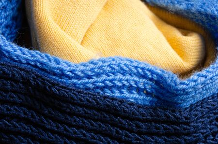 kneat sweater texture close up. Knitted woolen sweaters. Close-up. Selective focus. Multicolored wool yarn background. Close-up of knitting wool texture