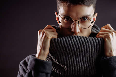 Close up of handsome young creative person, man in glasses, wearing winter coat and covering mouth with a wide scarf looking at camera, isolated over black background with copyspace