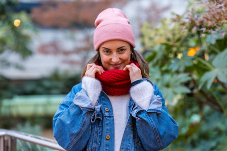 Young woman enjoying a winter day in the city, wearing a cozy pink beanie and a vibrant red scarf, radiating happiness and style