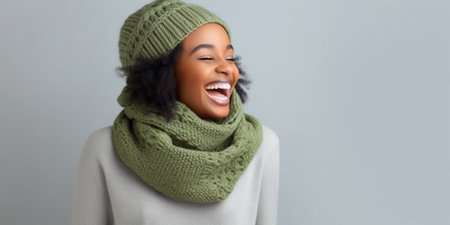 Beautiful Happy Laughing Young African American Woman with Green Hat and Scarf with Copy Space on a Gray Background