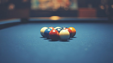 A close-up view of a pool table featuring a vibrant arrangement of billiard balls in a triangle formation, perfect for capturing the essence of the game.