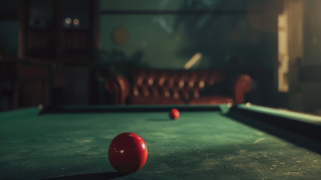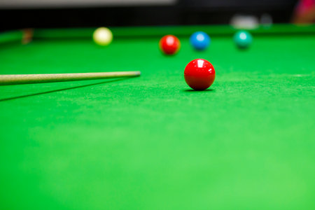 Close-up of red snooker ball on green table with cue in background. Concept of precision, sport, competition, and concentration in snooker or billiards.