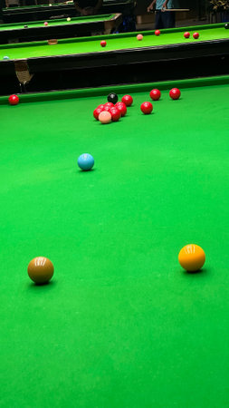 Playing snooker balls on the green game table in public place